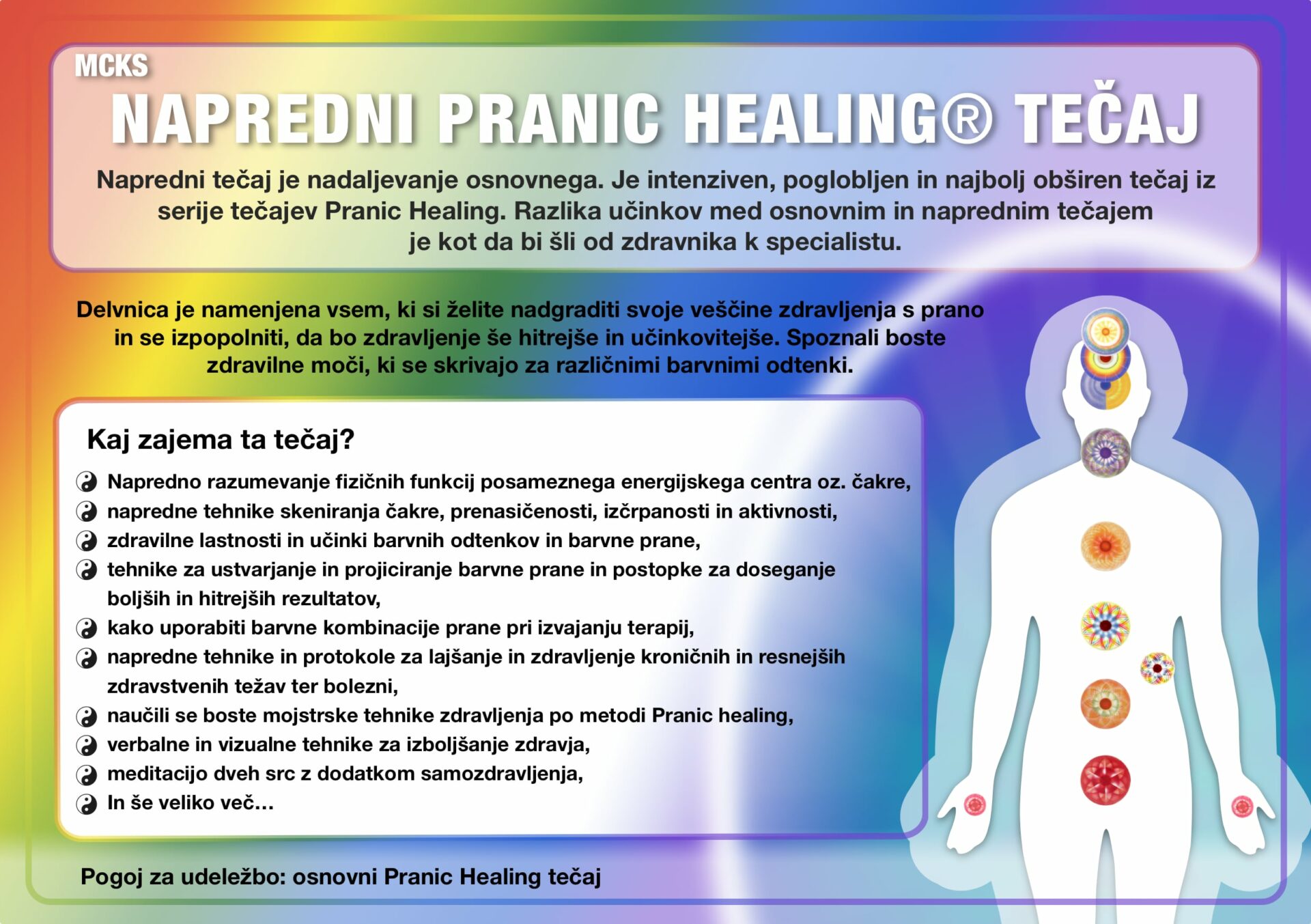 Napredni tečaj je nadaljevanje osnovnega. Je intenziven, poglobljen in najbolj obširen tečaj iz serije tečajev Pranic Healing. Razlika učinkov med osnovnim in naprednim tečajem je kot da bi šli od zdravnika k specialistu.